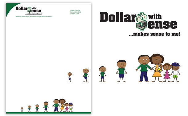 Identity package for Dollars with Sense financial literacy program including logo design, letterhead and illustration.