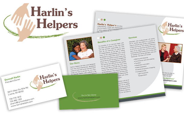Logo, business card and 3-panel brochure design for Harlin's Helpers.