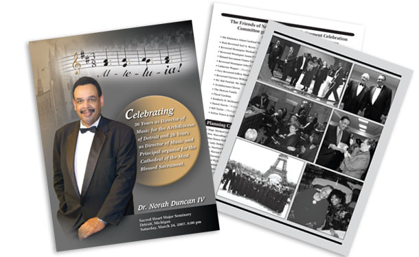 Program booklet for Dr. Norah Duncan IV's retirement celebration. The cover spreads of this booklet were full color with black and white inside pages.
