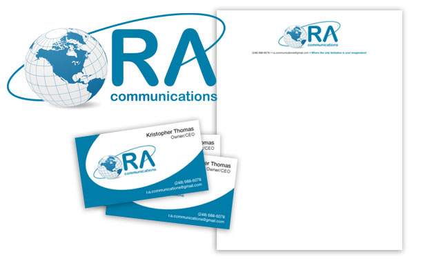 Identity package for R.A. Communications, including original logo, letterhead and business card design.