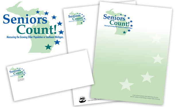 Identity package for Seniors Count. This package includes original logo design as well as letterhead and folder design.