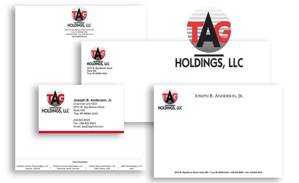 Identity package for TAG Holdings, LLC which is a global provider of manufacturing and service solutions. Package includes original logo, letterhead, envelope, memo and business card design.