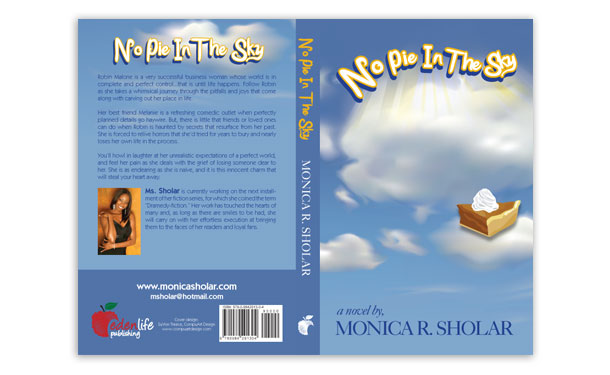 Book cover design and inside page layout for No Pie In The Sky, a novel by Monica R. Sholar. This book is 8.5"x11" and is 178 pages long.