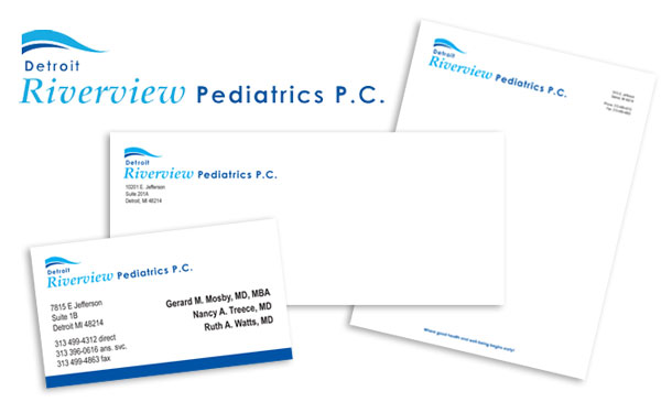 Identity package for Detroit Riverview Pediatrics P.C. Package includes original logo, letterhead, envelope, and business card design. CompuArt also designed all of their office signage.
